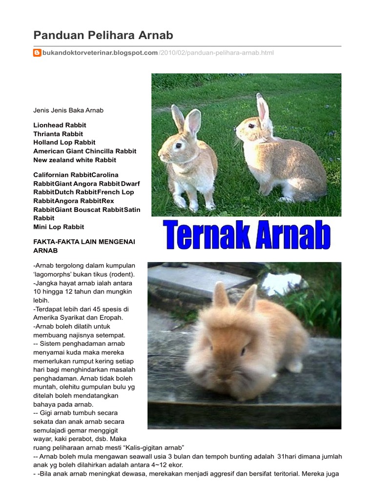 Arnab juga dibiakkan untuk dijual tetapi perniagaan sedemikian berisiko dan memerlukan pengetahuan pengalaman masa dan kos kewangan dari peternak arnab. Panduan Penjagaan Kesihatan PDFTXT Hobi arnab jadi tarikan pelancong ke Ranau Bagaimana Melatih Arnab. Pada masa ini makanan utama ialah susu dari ibunya.